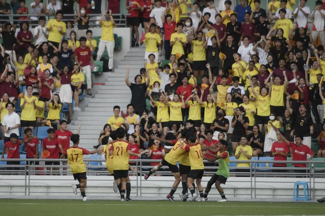 VJC celebrating after scoring the winner for the school to clinch the A Division boys’ football title.