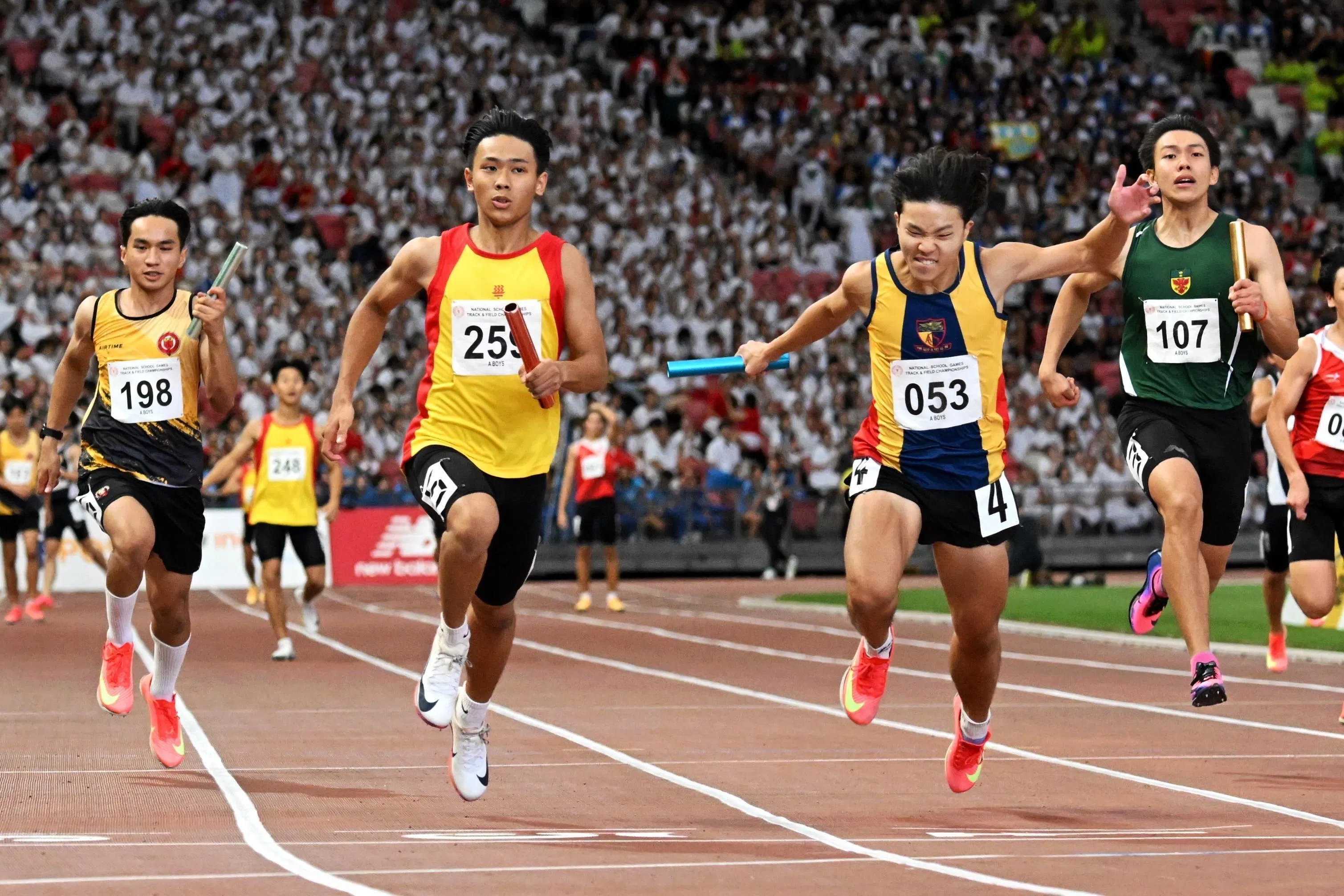Benjamin Shai (second from left), of Hwa Chong Institution, edging out ACS(I)’s Joshua Lee (No. 53) at the finish line of the A Division boys’ 4x100m relay.