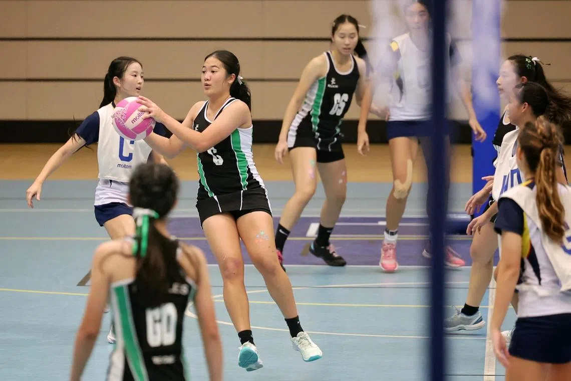 Raffles Institution’s Kaska Watkins taking aim during the National School Games A Division netball final. She scored 20 out of 24 shots in the 45-40 win over Anglo-Chinese Junior College.