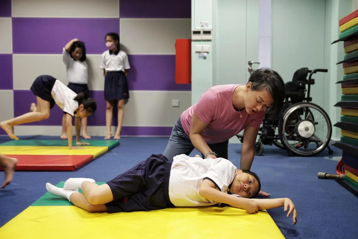 Cassandra Siua guiding primary 4 pupil Chen Xing Yi, a 10-year-old who has spinal muscular atrophy, in executing rolls during a gymnastics class at Cantonment Primary School.