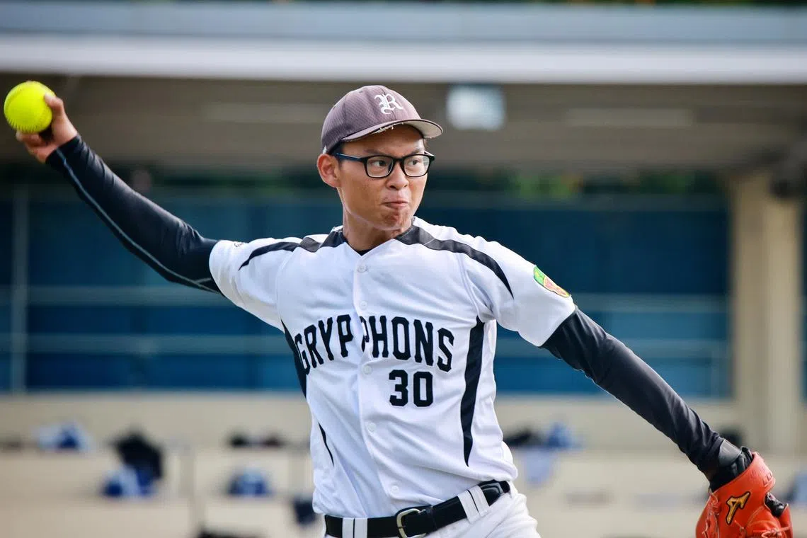 Raffles Institution’s Looi Zi Jenn pitching against Eunoia JC in the NSG final A division boys’ softball final on May 23.