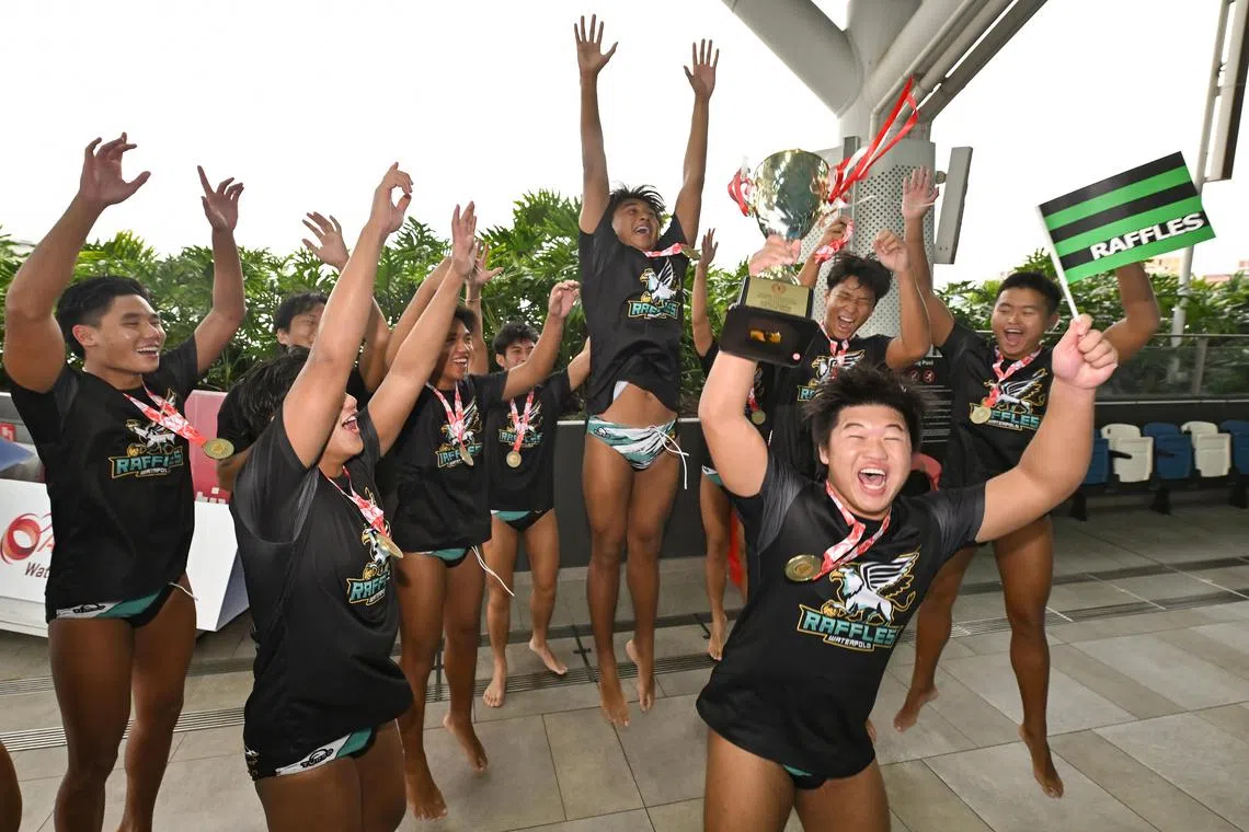 SINGAPORE – As the final whistle sounded, the stands where Raffles Institution (RI) supporters sat erupted, and the players in the swimming pool high-fived each other, climbing out in search of their coach Yu Lei before throwing him into the water.