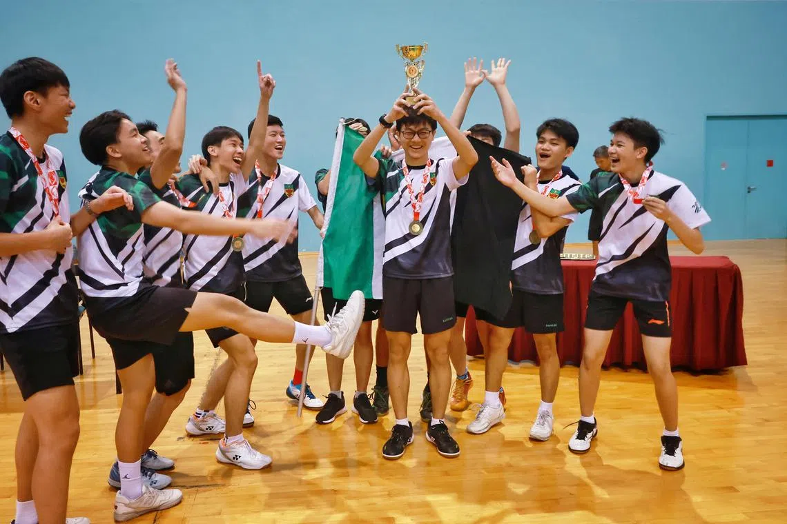 Raffles Institution lifting the trophy after emerging as champions in the A Division boys’ badminton final at the OCBC Arena on May 17.