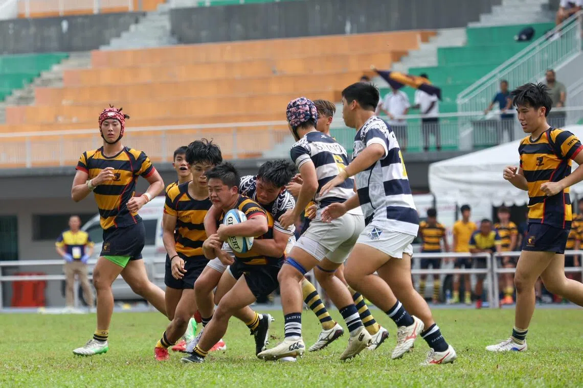 Players from St Andrew’s School (Secondary) and Anglo-Chinese School (Independent) battling on the field during the National School Games B Division rugby final at Jurong West Stadium on April 1.