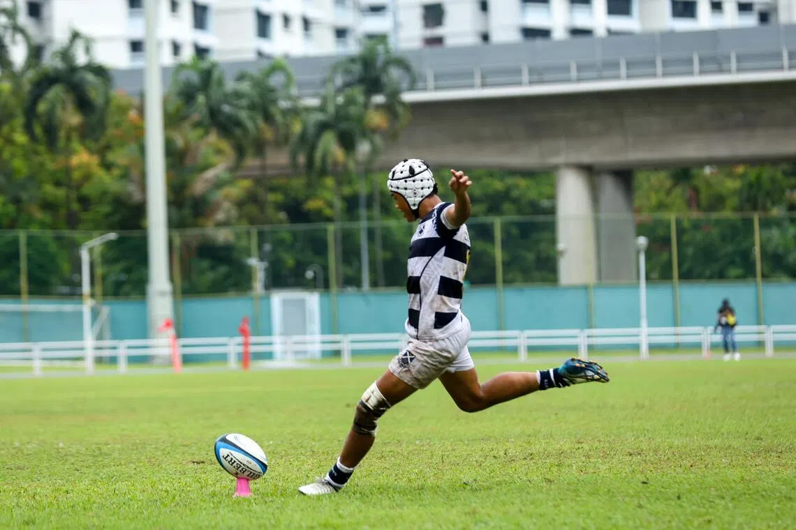 Wesley Choo of St Andrew’s School (Secondary) taking a kick during the National School Games B Division rugby final at Jurong West Stadium on April 1.