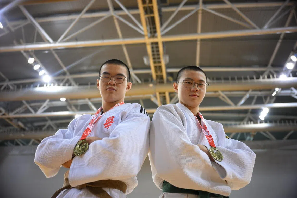 Brothers Teo Chee Hern and Chee Le (right) of Hwa Chong Institution pictured after winning the National School Games Judo B Division Boys 73kg (Middle) Final and National School Games Judo A Division Boys 81kg (Middle) Final respectively.