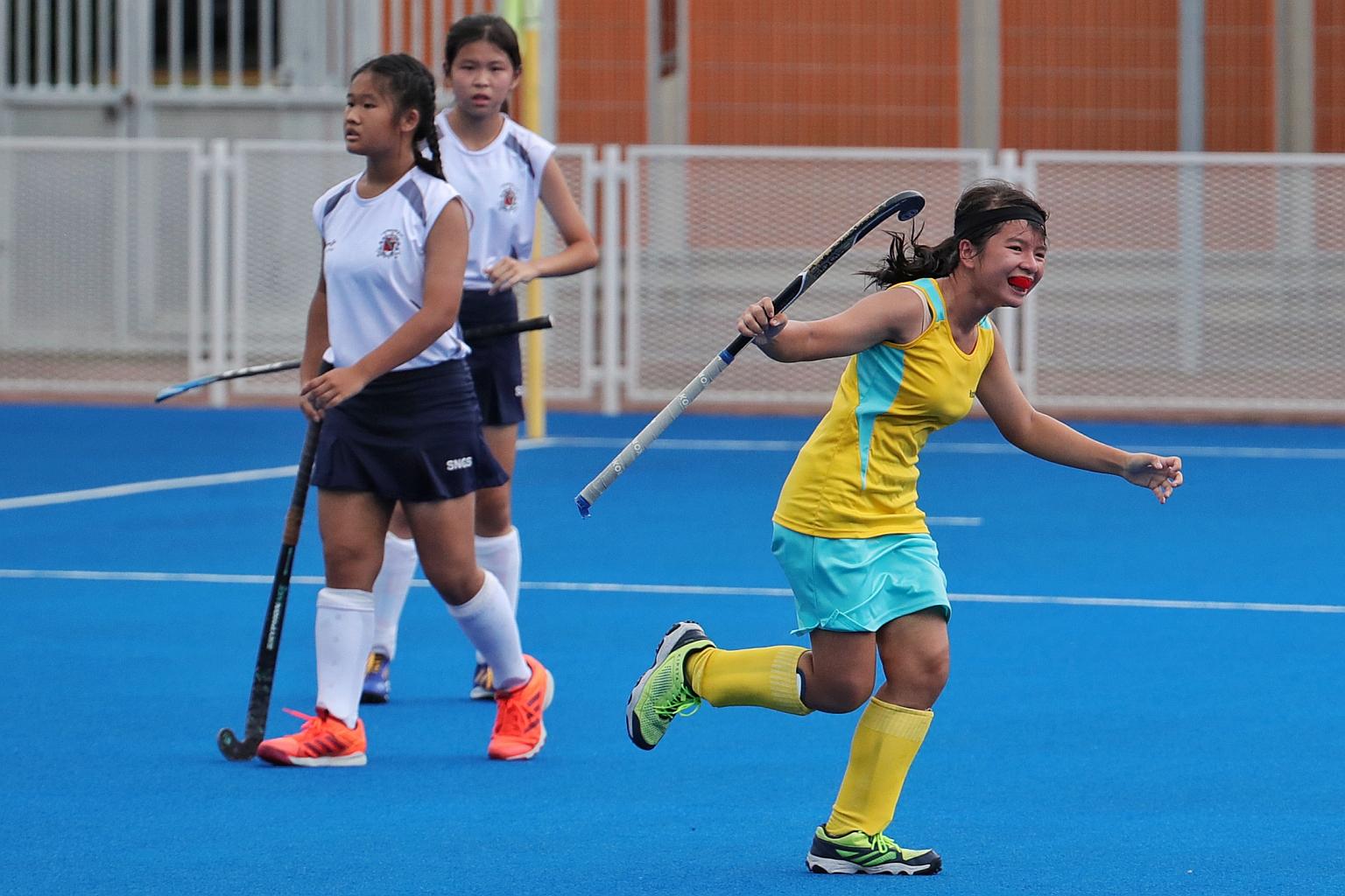 Danica Goh celebrates after scoring the winning goal against CHIJ St Nicholas Girls.