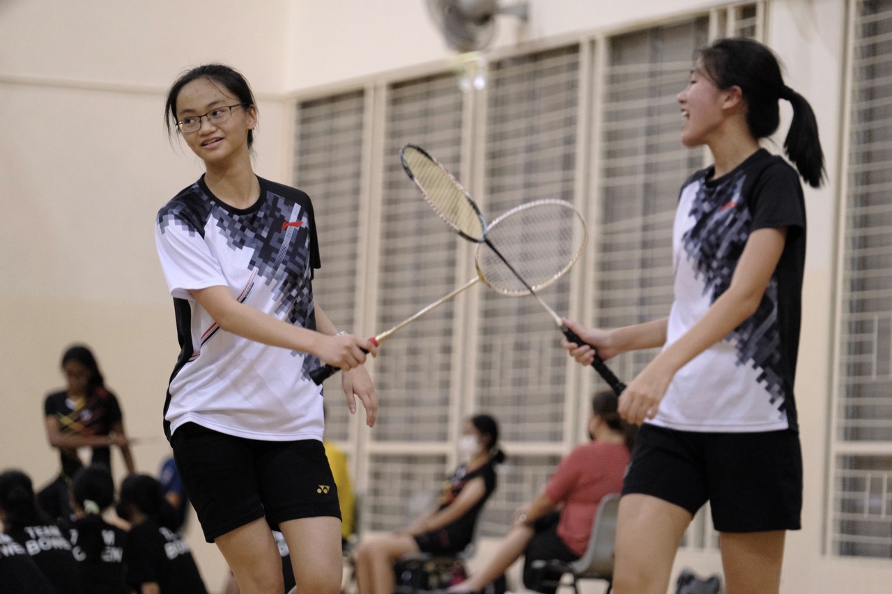 SCGS first doubles shuttlers Cheng Sher-Mae (left) and Avril Yau (right) after scoring a point at the Badminton Girls’ B Div North Zone final on April 26, 2022.