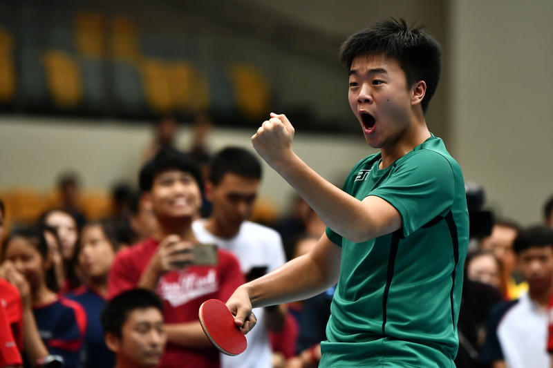 Raffles Institution's Lim Jun Kai celebrates after winning his game against Jaedon Foo from Hwa Chong Institution in the Schools National B Division Boys table tennis final at Our Tampines Hub on April 24, 2019.