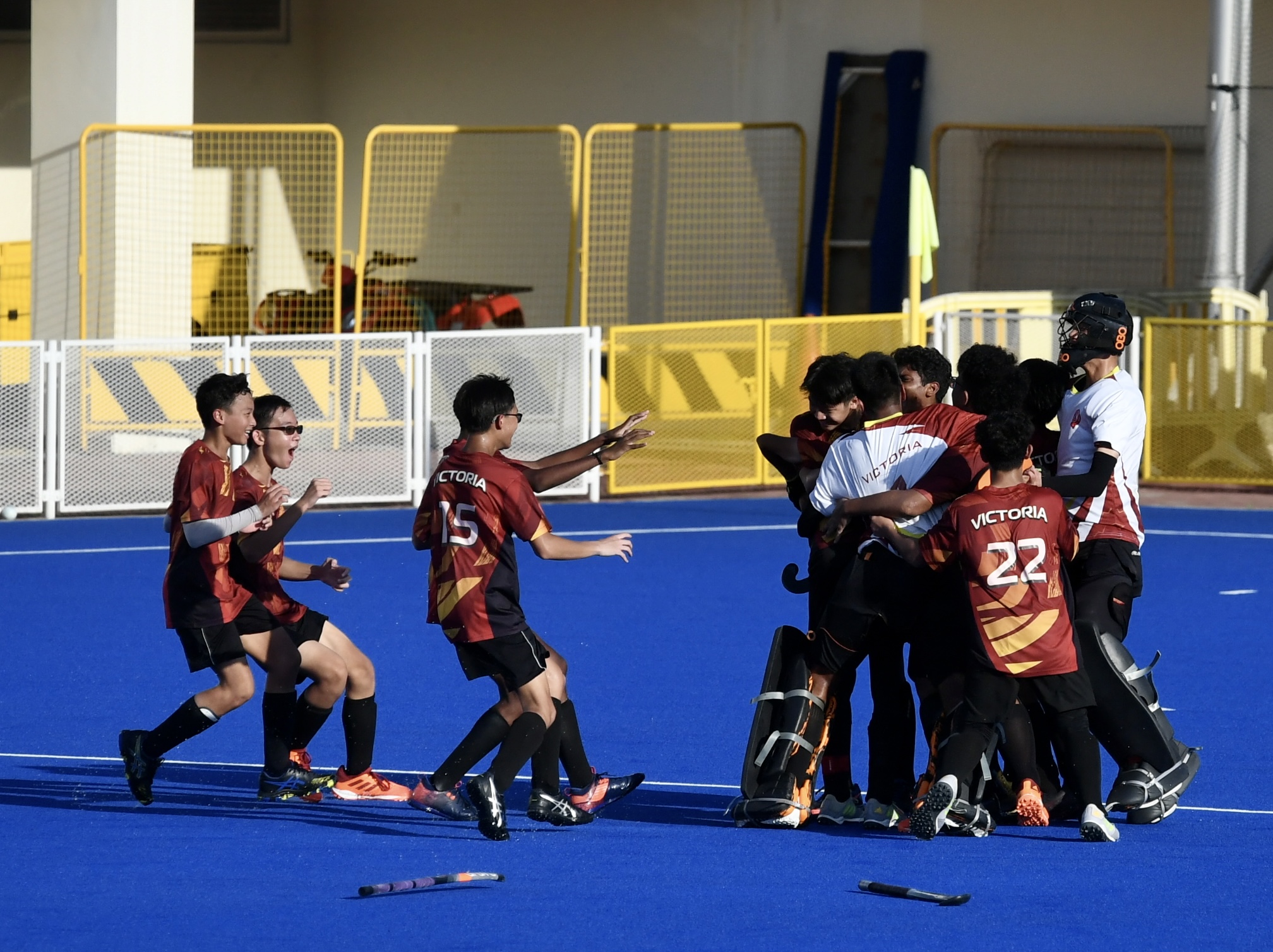 Victoria School players celebrating their victory at the end of the match against Raffles Institution on May 17, 2022.