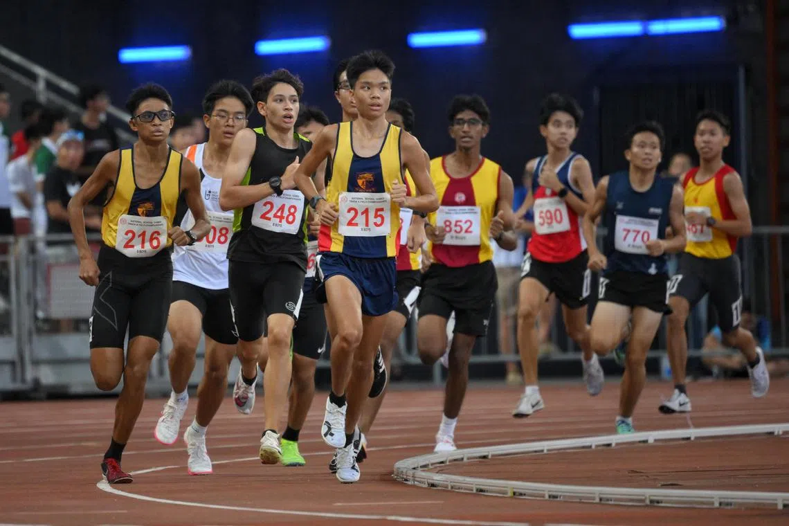 Reuben Loke of Anglo-Chinese School (Independent) leading the pack during the B Division boys' 1500m final.