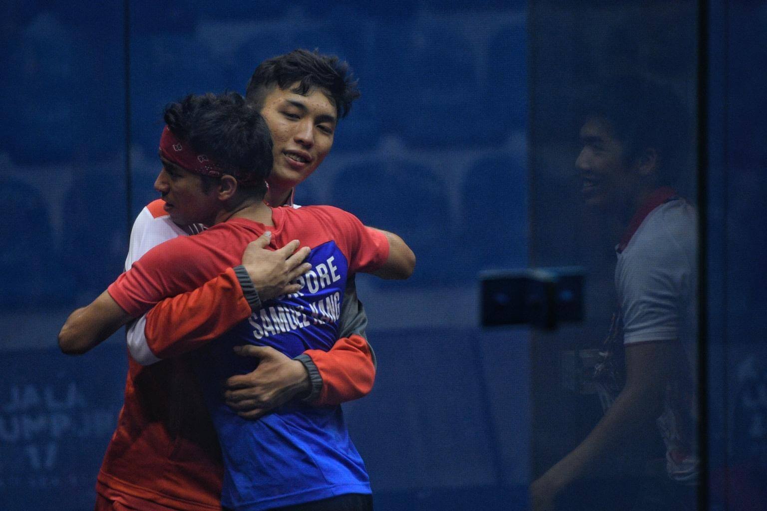 Samuel Kang of Singapore celebrates with compatriot Benedict Chan after defeating Philippines during the SEA Games men's squash team finals held on Aug 29, 2017.