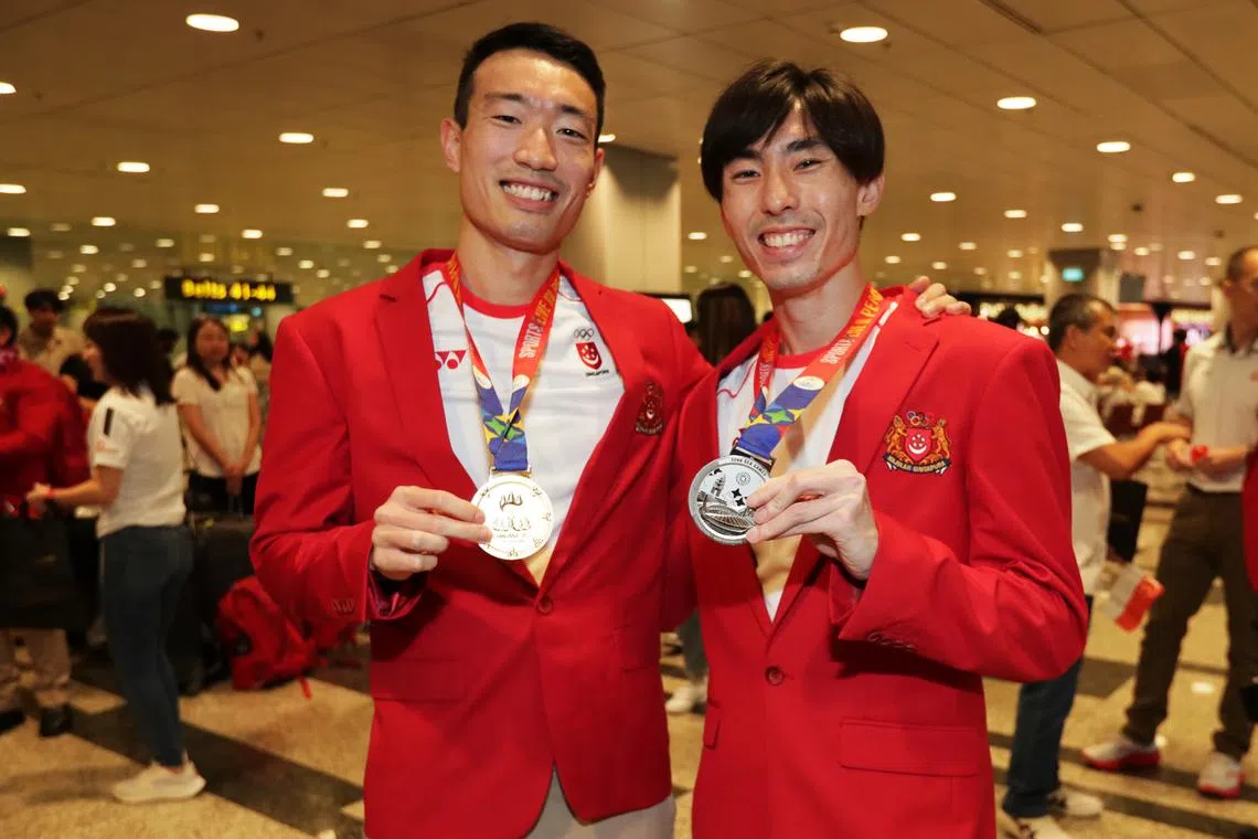 Hurdler Ang Chen Xiang (left) and marathoner Soh Rui Yong at Changi Airport on Saturday.
