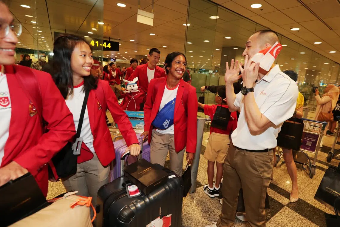 Singapore’s athletics contingent arriving at Changi Airport from Cambodia on Saturday.
