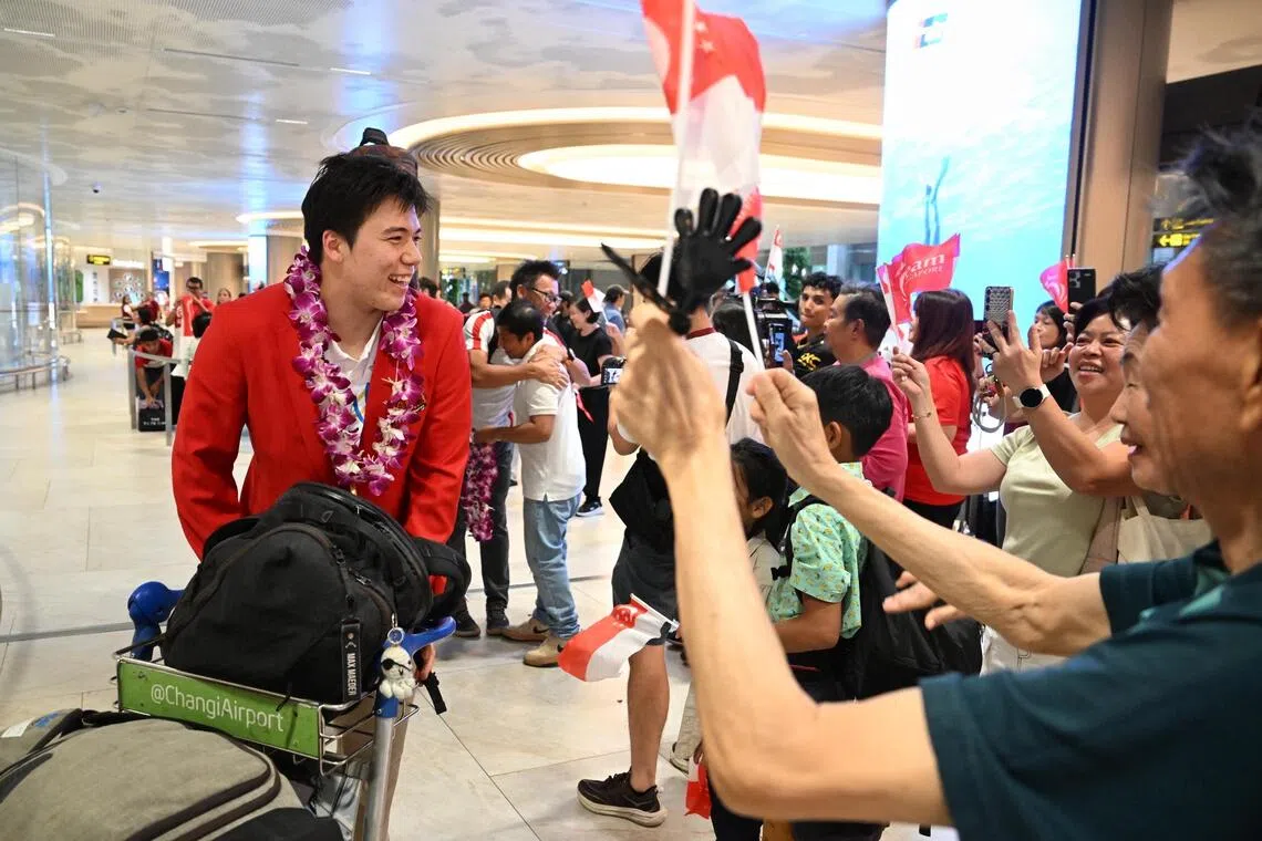 Max Maeder is greeted by supporters as the Singapore sailing contingent arrives at Changi Airport Terminal 2, following the conclusion of their 2025 SEA Games campaign, on Dec 19, 2025.