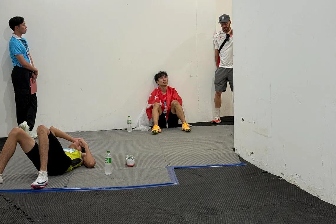 Calvin Quek sits in disbelief on the floor at the mixed zone just ahead of speaking to the media
