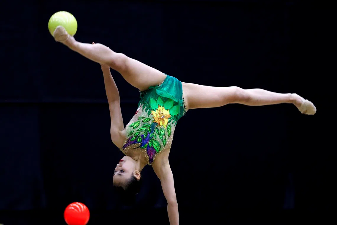Mikayla Yang in action during the SEA Games rhythmic gymnastics women’s individual all-around ball round, which saw her remain at the top of the standings before the final two rounds. She ended up winning the silver on Dec 16 in Pathum Thani.