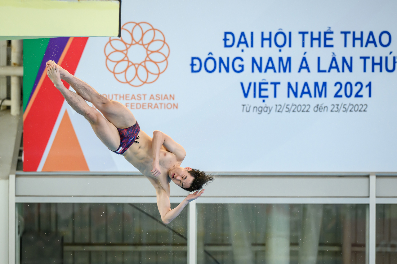 Singapore diver Avvir Tham executing a dive during the men's 1m individual springboard event at the Hanoi SEA Games on May 9, 2022.