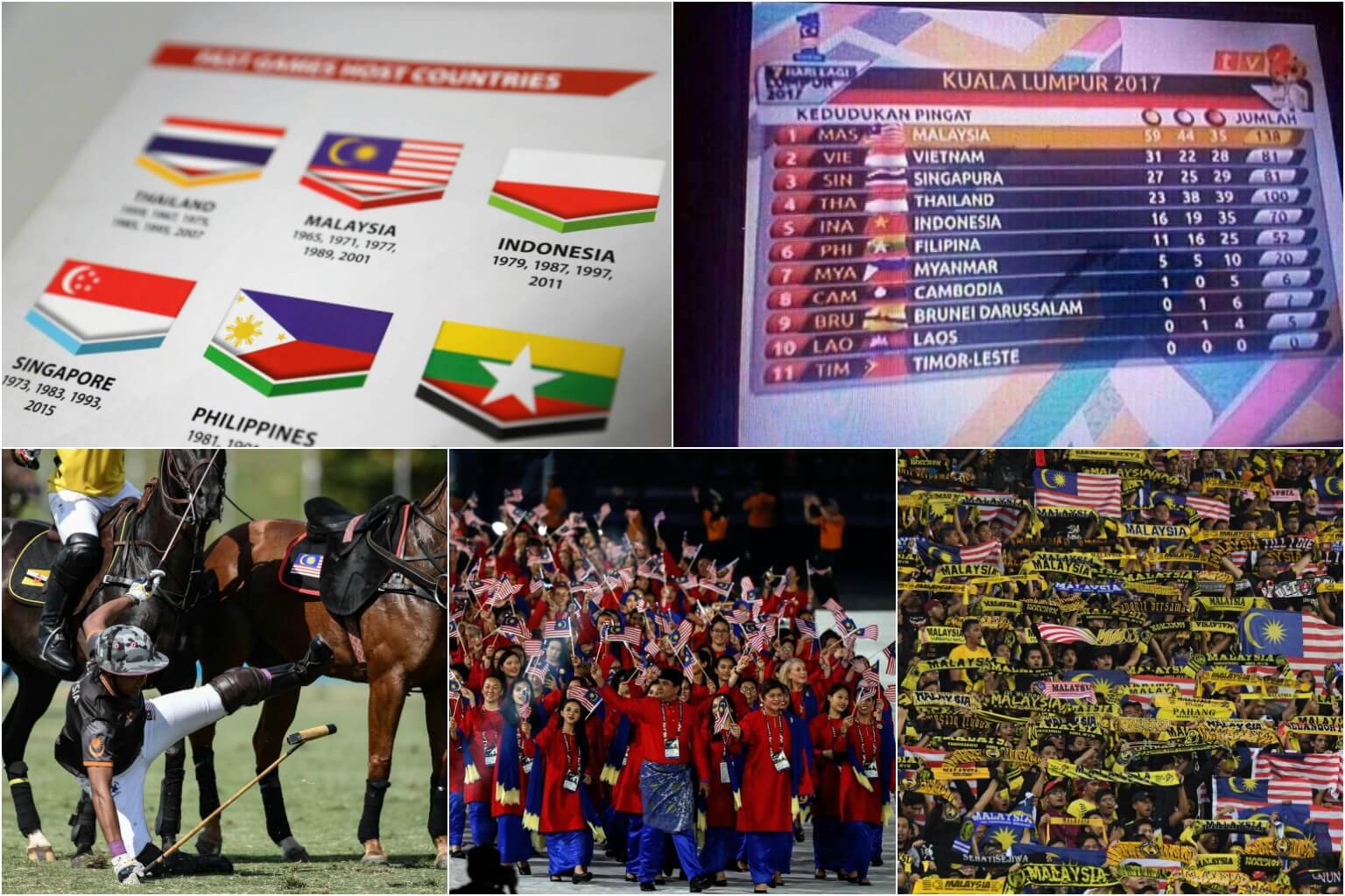 (Clockwise from top left) A misprinted Indonesian flag, Malaysia's national broadcaster RTM got eight of 11 flags wrong in a medal tally, Malaysian football fans cheer during their semi-final football match, athletes and officials of Malaysia during the opening ceremony of the SEA Games 2017 and Malaysia's Khairy Jamaluddin Abu Bakar falls off his horse.
