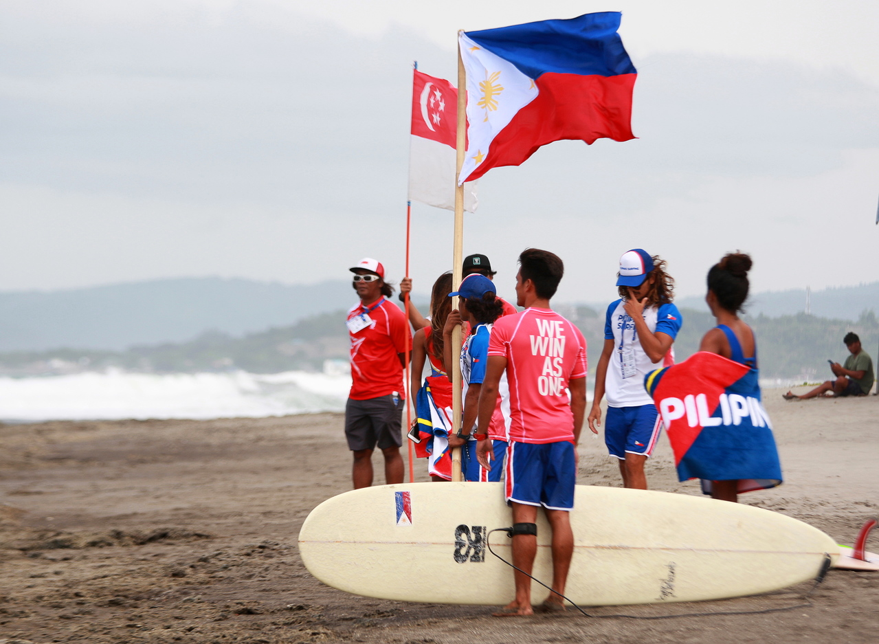 Filipino and Singaporean surfing team members during the Surfing events of the Southeast Asian Games in San Juan, La Union province, Philippines on Dec 2, 2019.