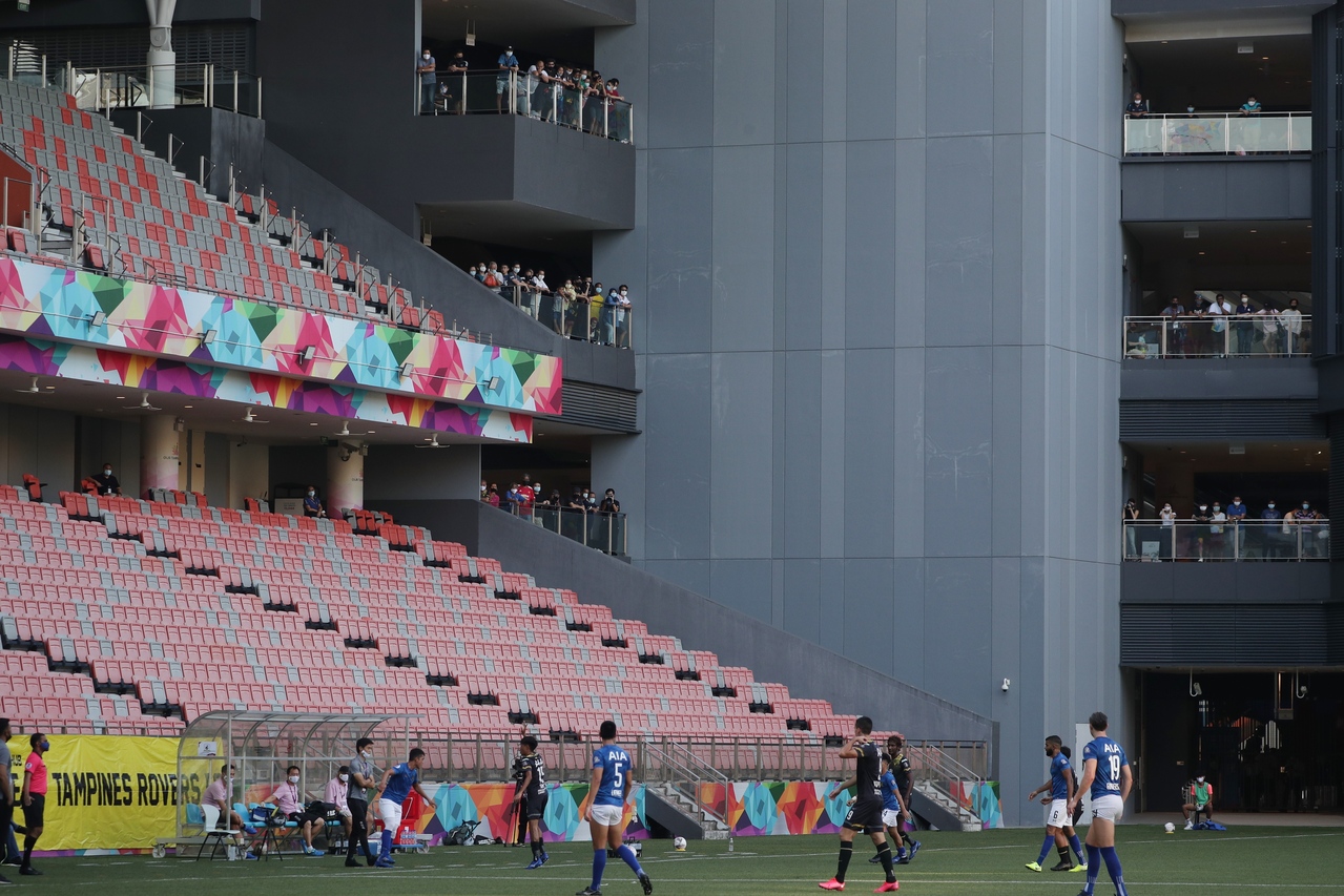 A handful of fans watching the Singapore Premier League game at Our Tampines Hub on Oct 17, 2020.