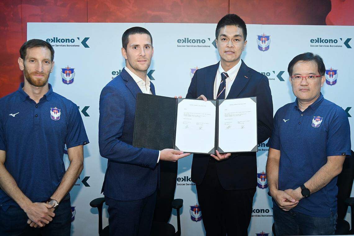 (From left) Marcal Trulls, director of Albirex Niigata's new department of methodology, Miquel Farrerons, CEO of Ekkono Soccer Services Barcelona, Albirex Niigata chairman Daisuke Korenaga and Albirex general manager Koh Mui Tee.