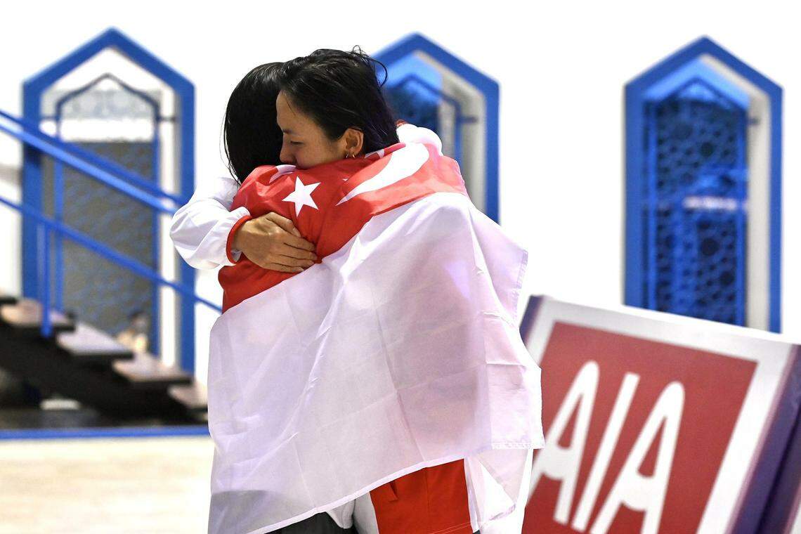 Quah Ting Wen (right) and Amanda Lim hug after they finished first and second respectively in the women’s 50m freestyle final at the SEA Games.