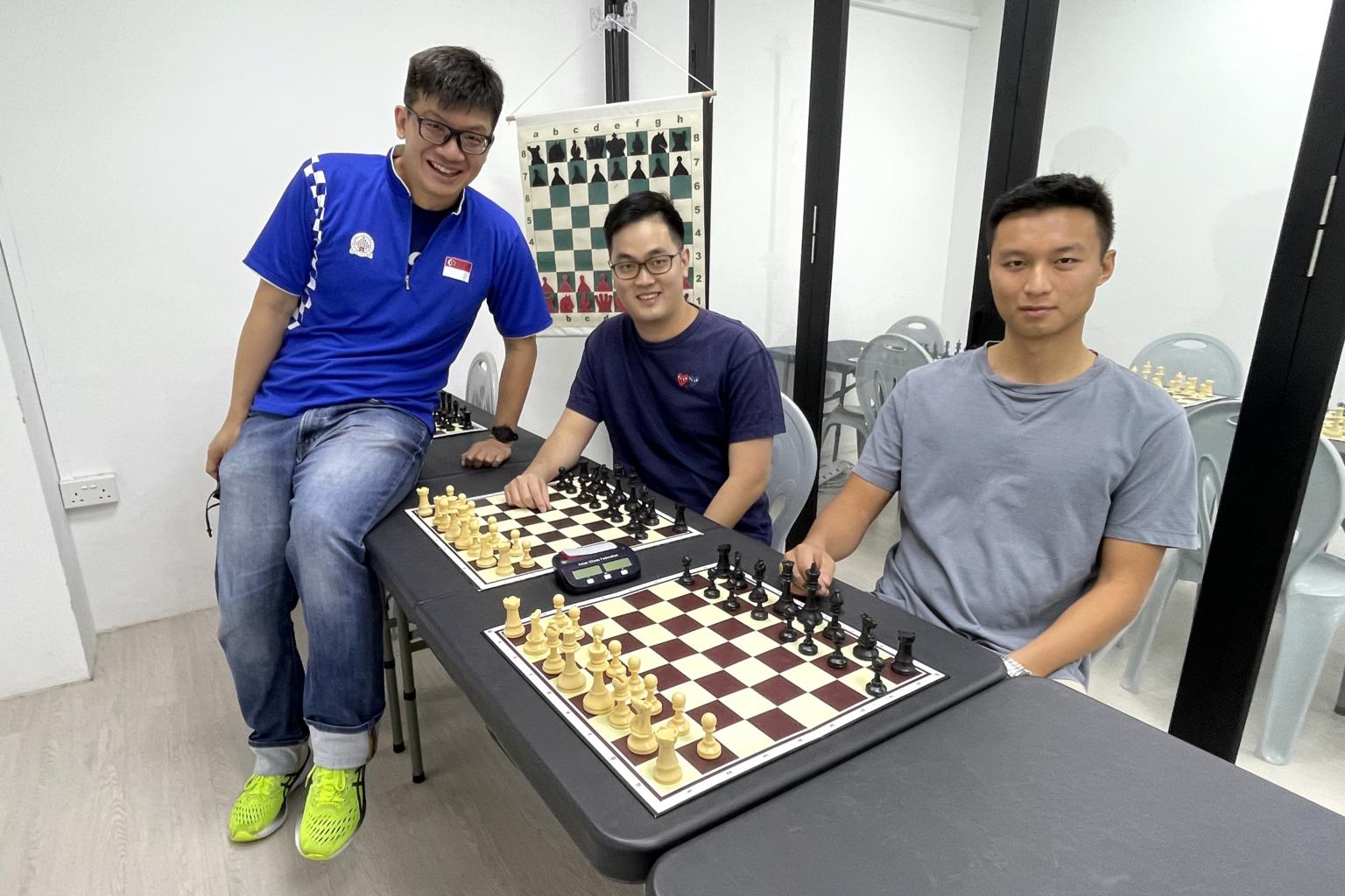 (From left) Singapore Chess Federation vice-president Kevin Goh with chess enthusiasts Zhang Changjie and Zhang Taiyang.