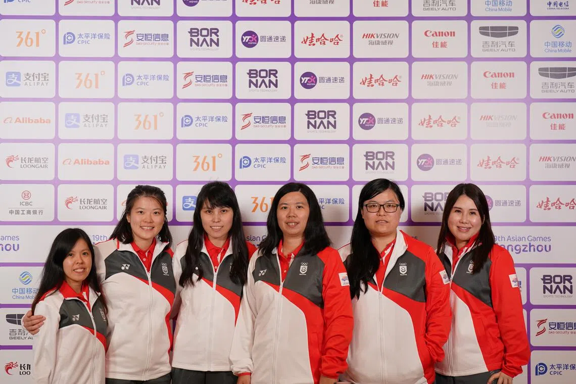 (From left) Singapore’s women's team of Leong Jia Min, Jazlene Ong, Low Siok Hui, Lim Jing Xuan, Li Lan and Selene Tan have secured at least a bronze at the Asian Games.