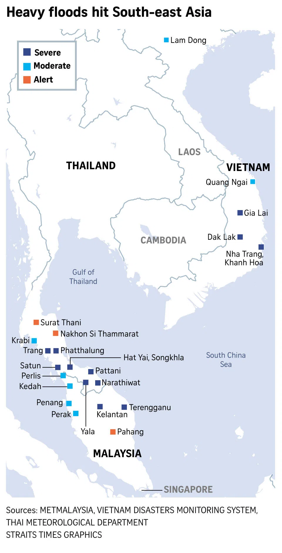 - Songkhla, Thailand, a SEA Games venue, is a disaster zone due to severe floods caused by record rainfall.