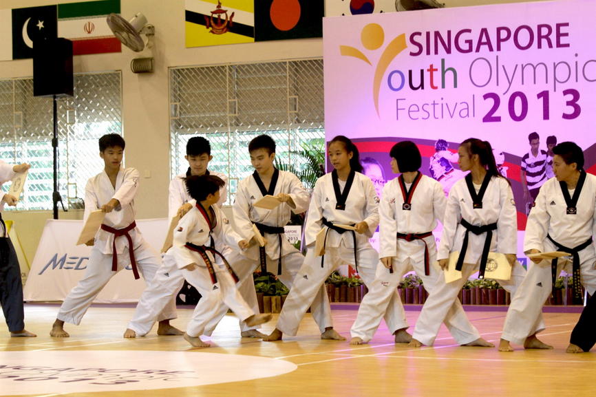 Taekwondo exponents putting on a demonstration at the opening ceremony of the Singapore Youth Olympic Festival in 2013.