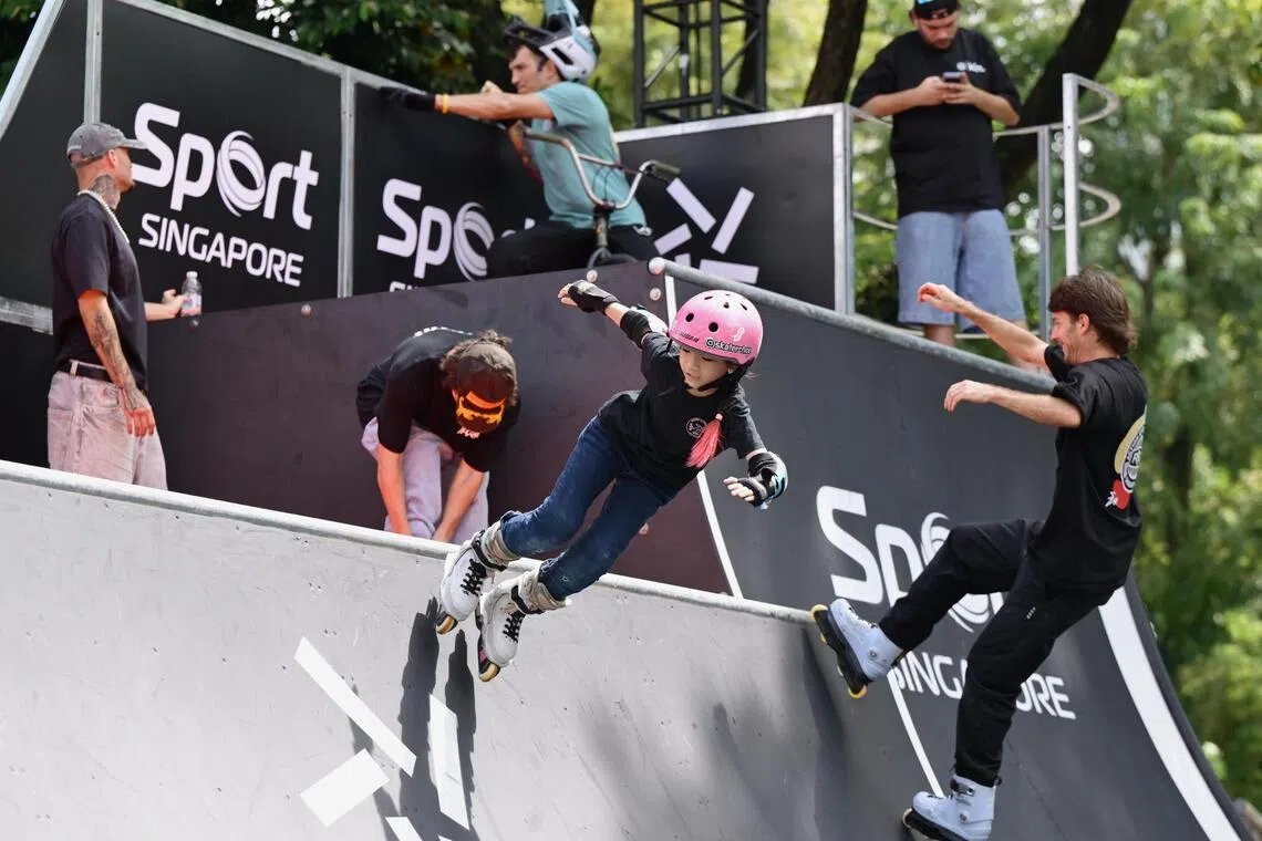 Eight-year-old Chloe Chua, an inline skater at Festival International des Sports Extremes (FISE) at *SCAPE on Nov 23, 2025.