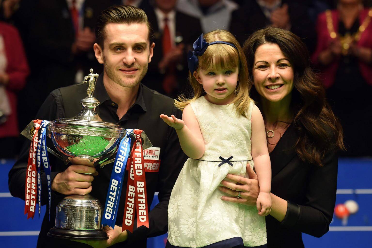 England's Mark Selby poses for a photograph with the trophy, his daughter Sofia Maria and wife Vikki, after beating Scotland's John Higgins in the World Championship Snooker final at The Crucible in Sheffield, northern England on May 1, 2017.