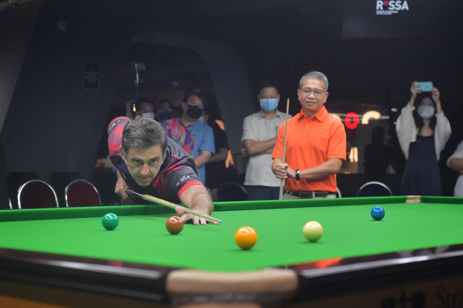 Snooker legend Ronnie O'Sullivan plays a friendly game with Minister Edwin Tong (in orange) at the launch of the Ronnie O'Sullivan Snooker Academy at The Grandstand on June 11, 2022.