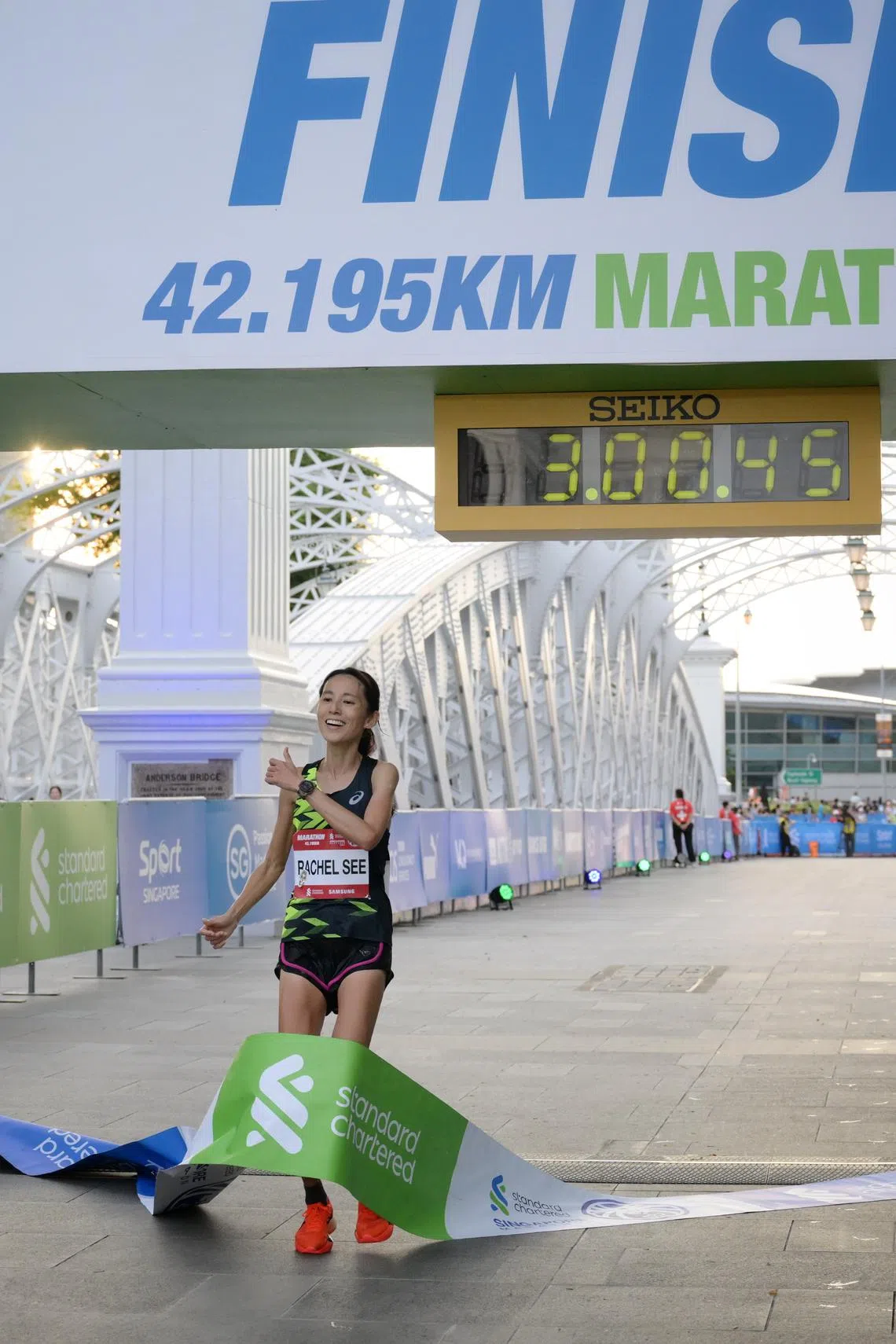 Singaporean Rachel See winning the female National Championship title at Stanchart Marathon 2024 on Dec 1.