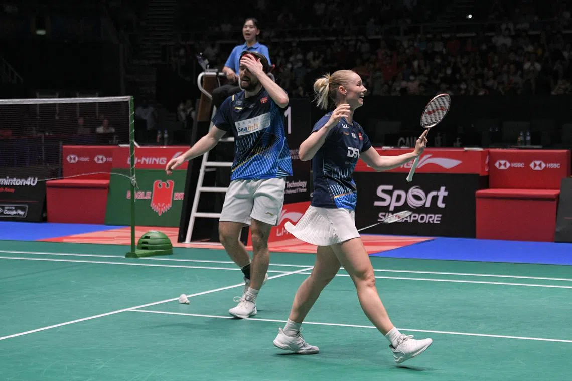 Denmark’s Mathias Christiansen (left) and Alexandra Boje celebrate after beating Japan’s Yuta Watanabe and Arisa Higashino during the mixed doubles event.