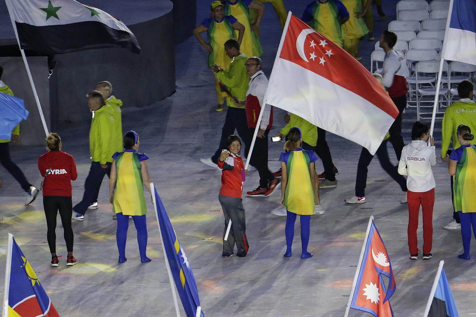 Singapore's flag bearer Griselda Khng taking a selfie during the closing ceremony of the Rio 2016 Olympic Games at the Maracana in Rio de Janeiro, Brazil, on Aug 21, 2016.