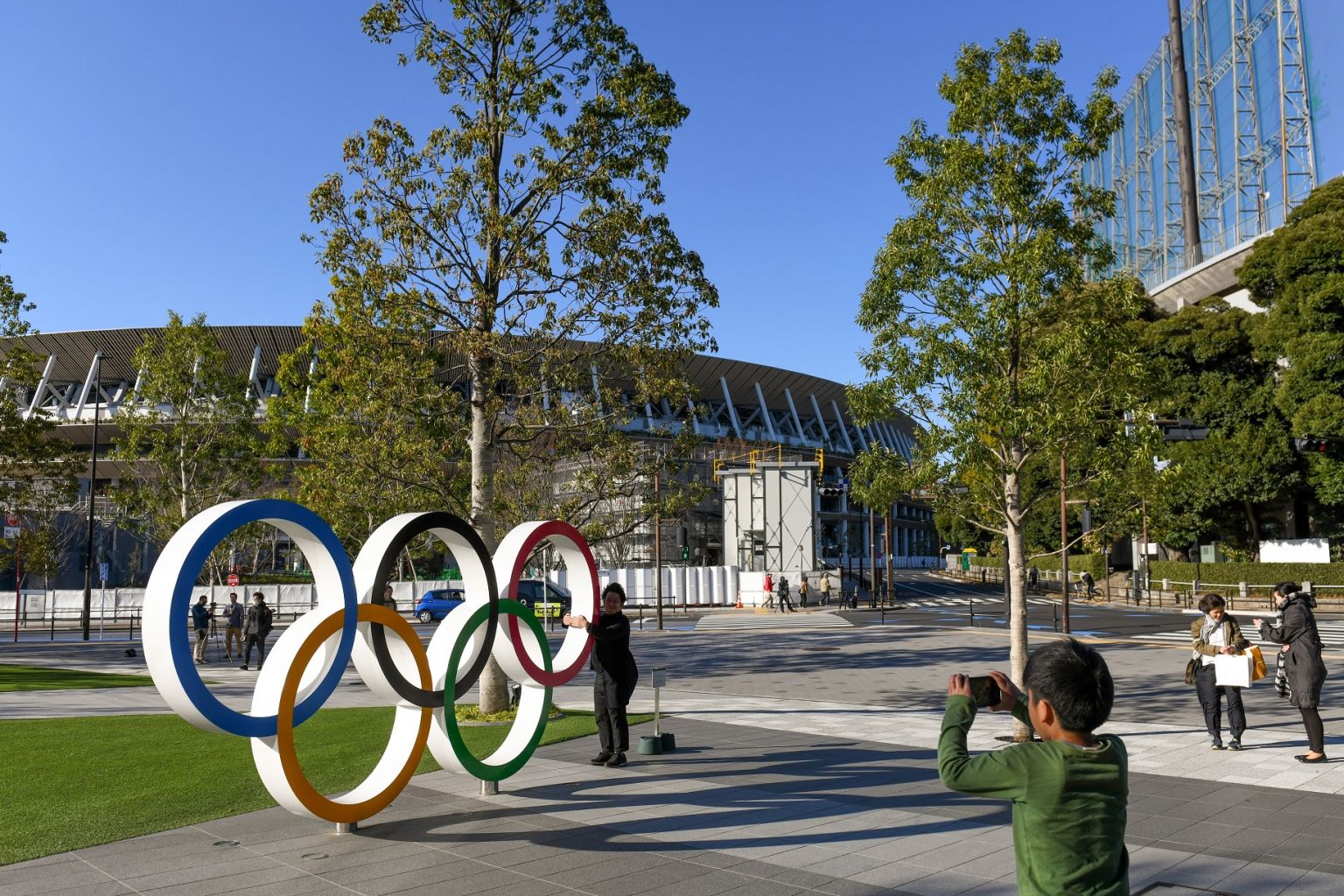 Pedestrians take photos of the Olympics rings at the Japan Olympic Museum in Tokyo, March 24, 2020.