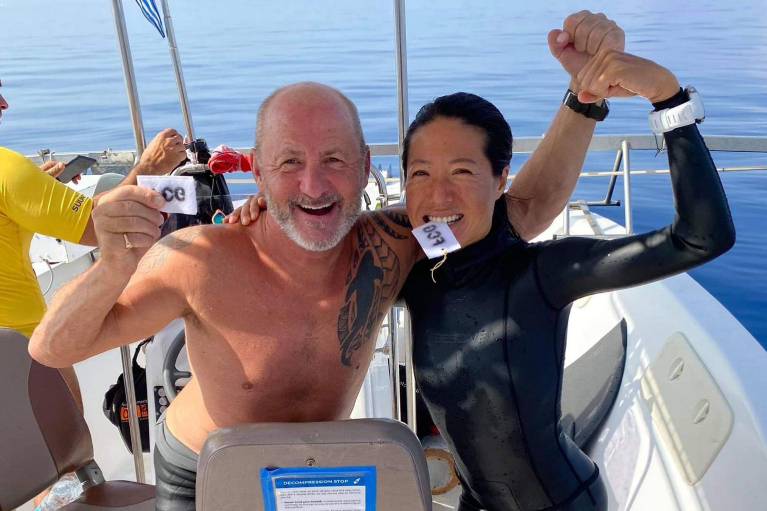 British freediver David Tranfield with Singapore freediver Lim Anqi after completing a successful 51m dive in the no fin discipline, on Aug 27, 2021.