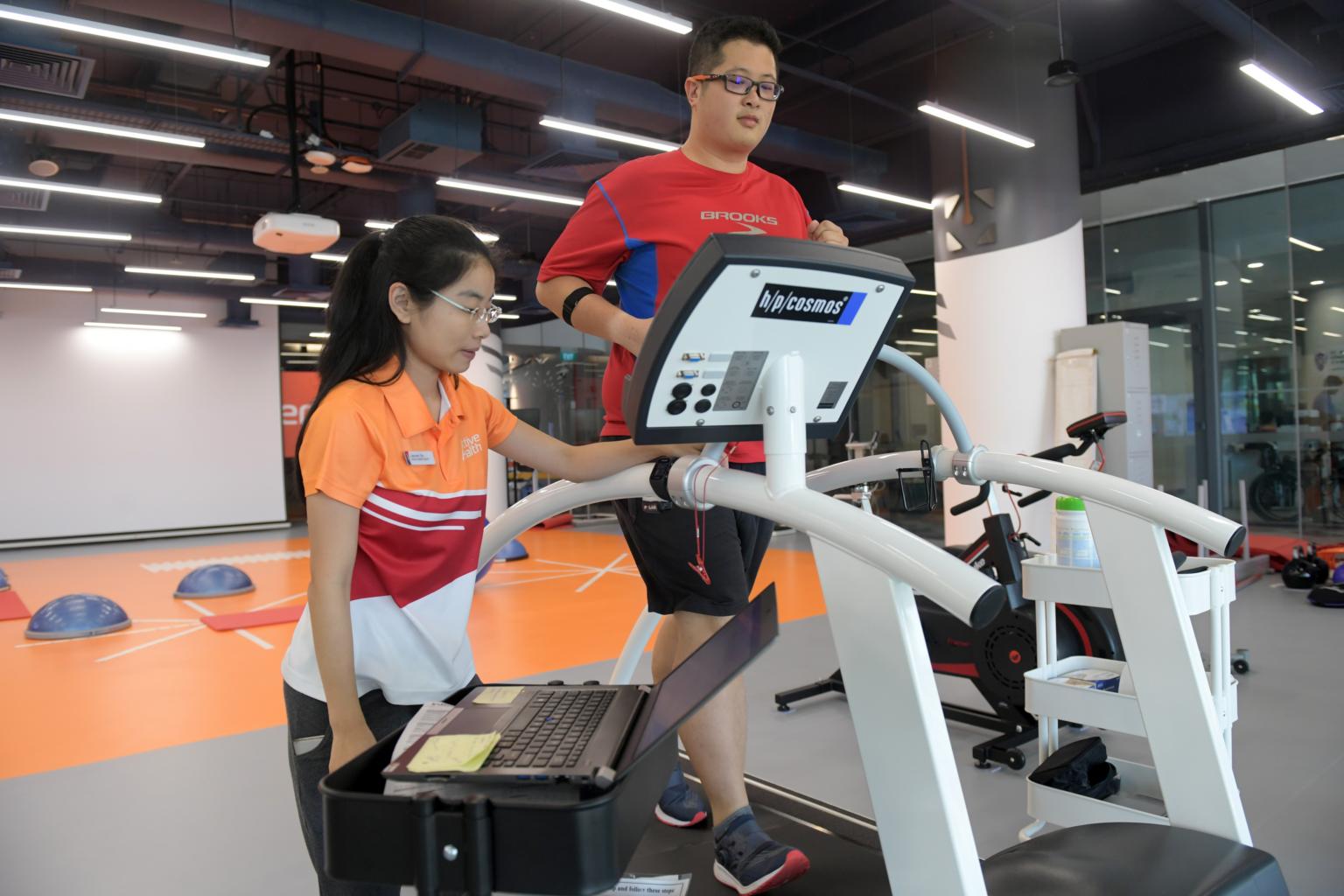 Mr Joseph Chen, 27, is assisted by Ms Jasmine Tan, 30, an Active Health Expert from the Active Health Lab, during a treadmill exercise designed to bring his heart rate up to a specified intensity, on March 6, 2018.