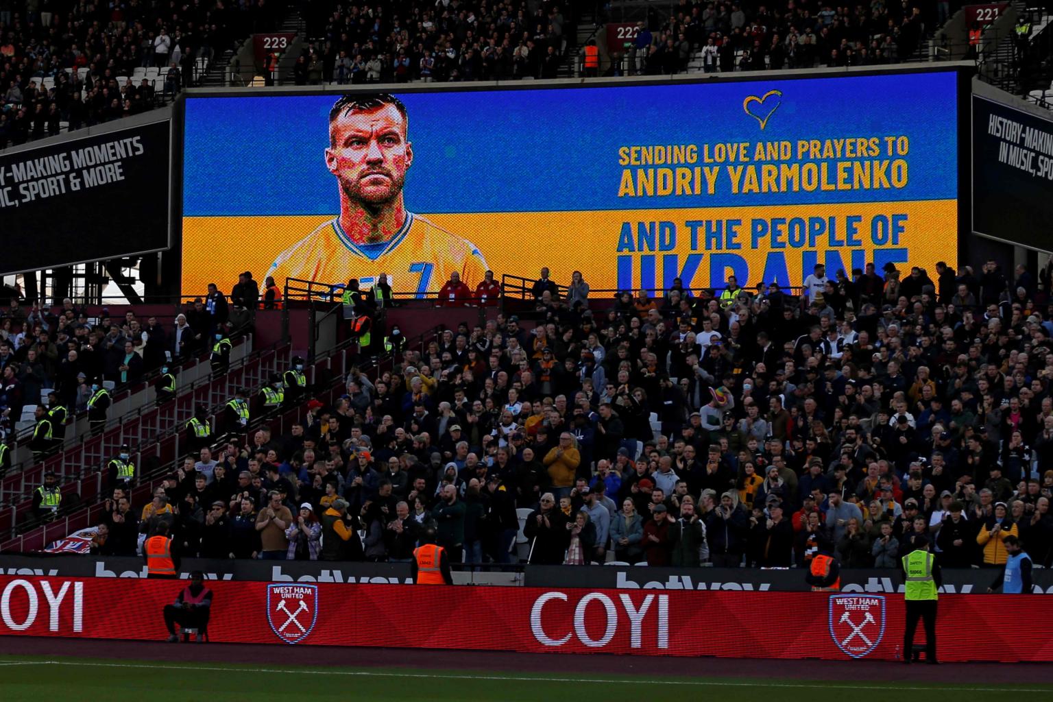 A tribute to West Ham United's Ukrainian striker Andriy Yarmolenko and the people of Ukraine, before the EPL match against Wolverhampton Wanderers, on Feb 27, 2022.