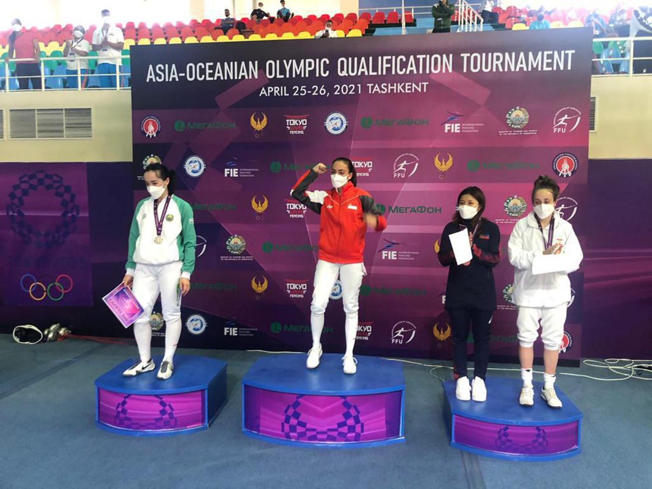 Amita Berthier (centre) celebrating on the podium after topping the women's foil, on April 25, 2021.