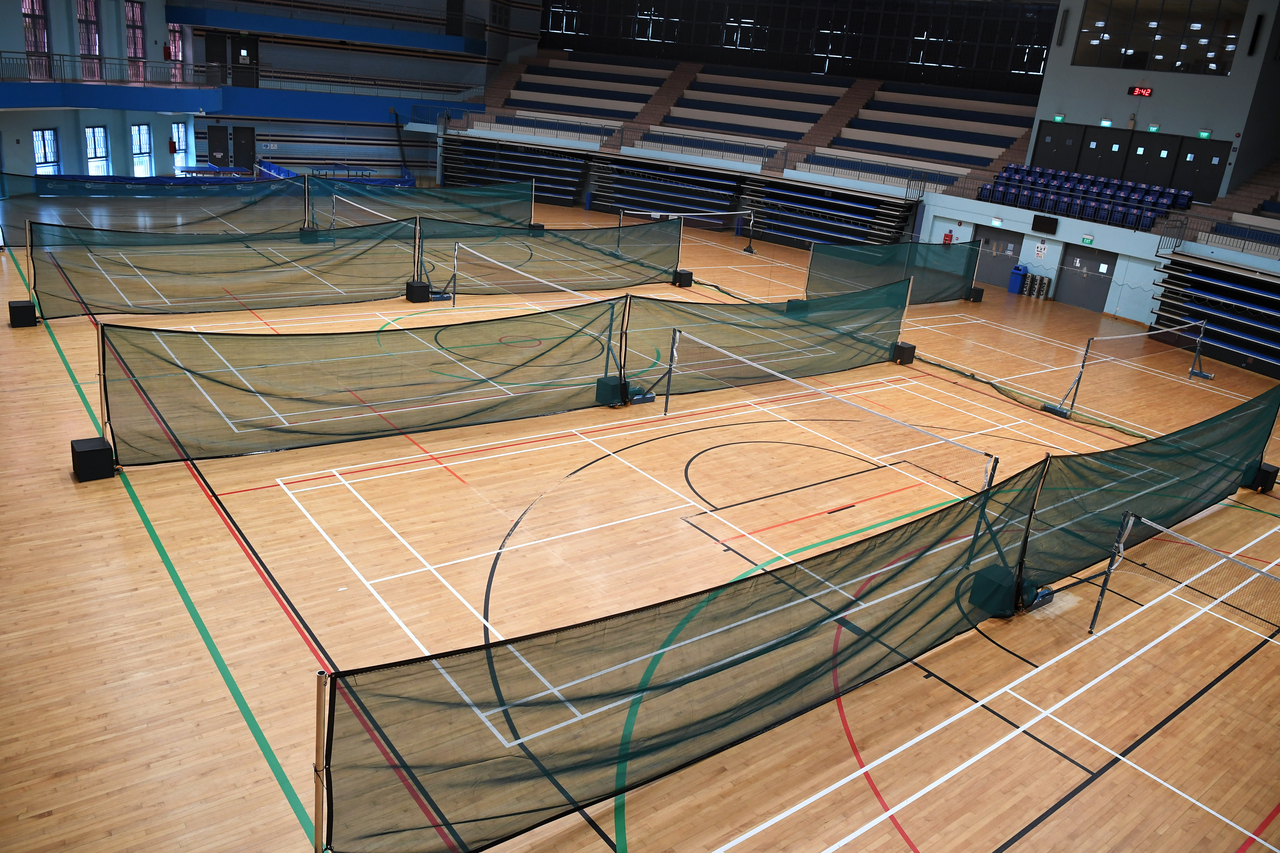 Badminton courts at the sports hall at Jurong East Sport Centre in Singapore.