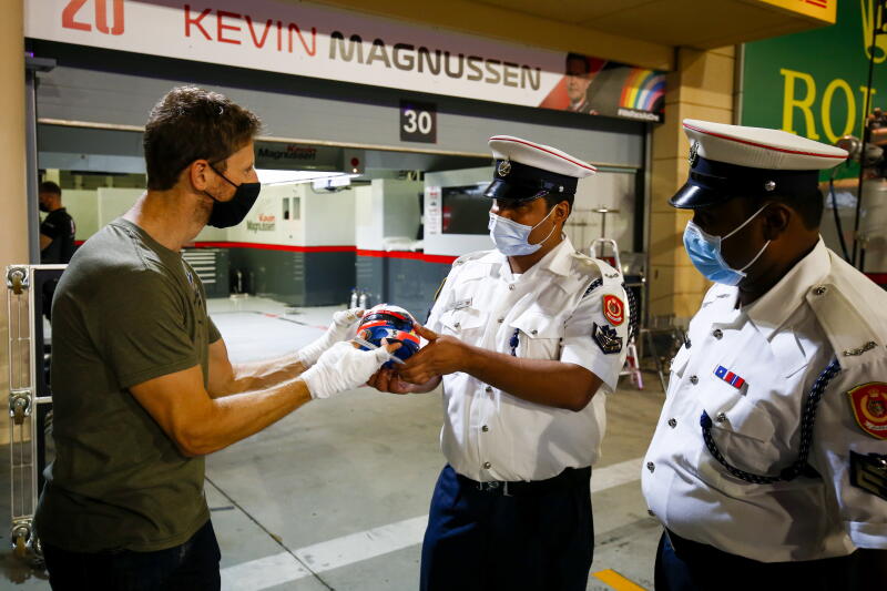 Romain Grosjean (left) of the Haas F1 Team presenting a gift to officials at Bahrain International Circuit near Manama, Bahrain, on Dec 3, 2020.