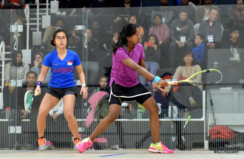 National squash player Au Yeong Wai Yhann (left) in action during her quarter-final loss against top seed Sivasangari Subramaniam of Malaysia at the British Junior Open on Friday.