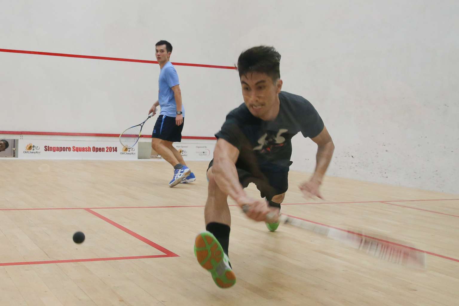 Ong Beng Hee (in blue) defeats Valentino Bong in the final of Old Chang Kee Singapore Squash Open at the Kallang Squash Centre on Dec 21, 2014.
