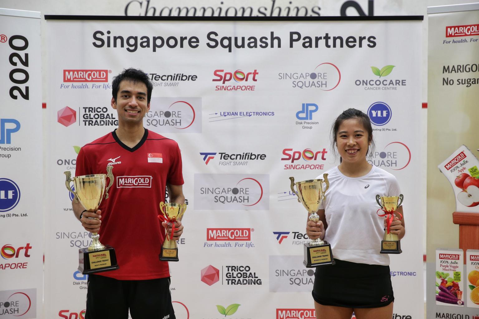 Samuel Kang and women’s final winner Au Yeong Wai Yhann at Kallang Squash Centre on Dec 5, 2020.