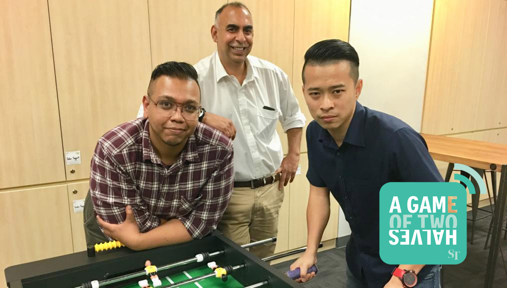 Host Sazali Abdul Aziz (left) is joined by his ST sports colleagues Rohit Brijnath (centre) and David Lee (right) as they discuss one international and one local sports talking point each week in the podcast A Game Of Two Halves.