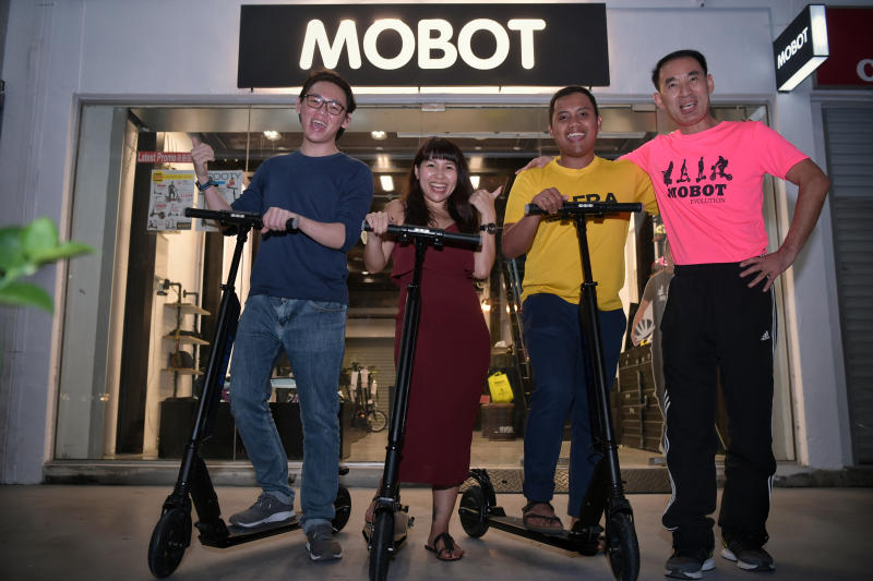 (From left) Winners of the Mobot e-scooters, Lee Yong Shun, Talia Lim and Muhammad Syamshidi Othman, with Mobot director Ifrey Lai.