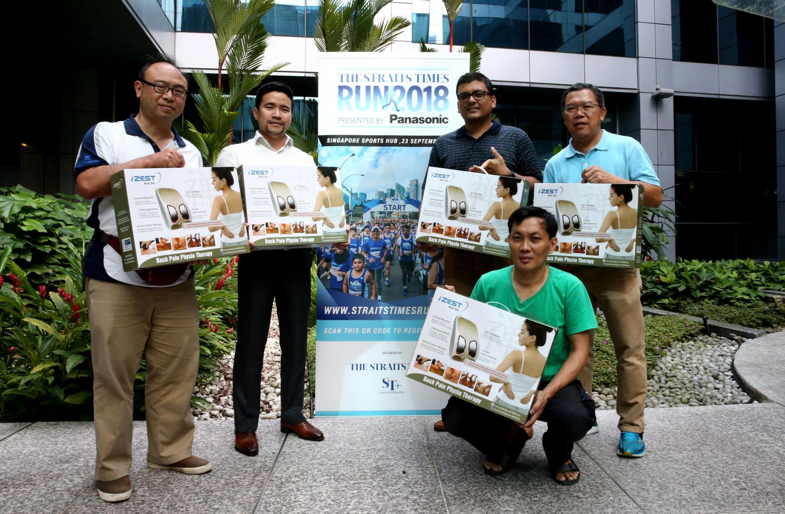 Happy ST Run winners of an iZest Back Zen worth $499 are (standing, from left) Wong Chok Tung, Ton Kuei Lim, Anurag Patra, Ng Kok Hian and Wong Kum Wing (squatting).